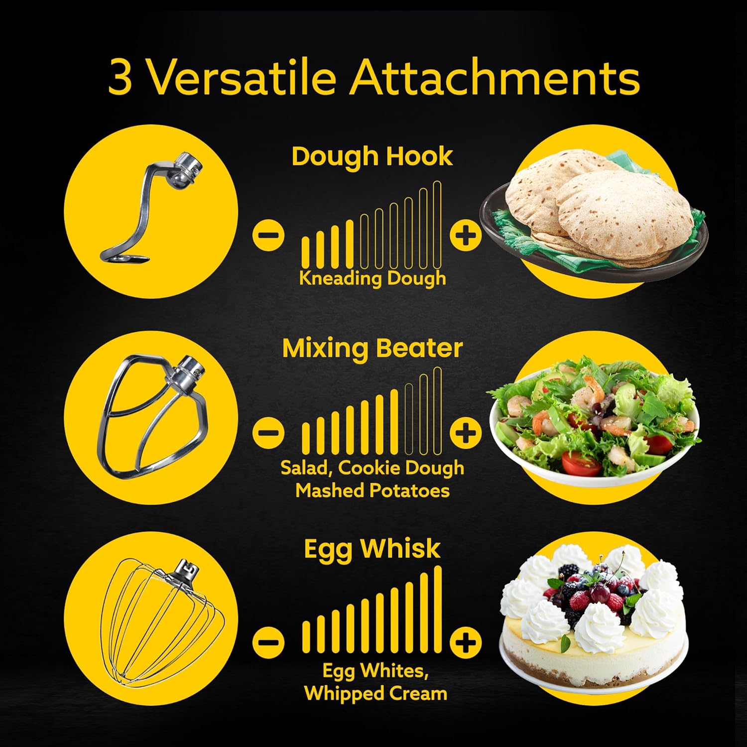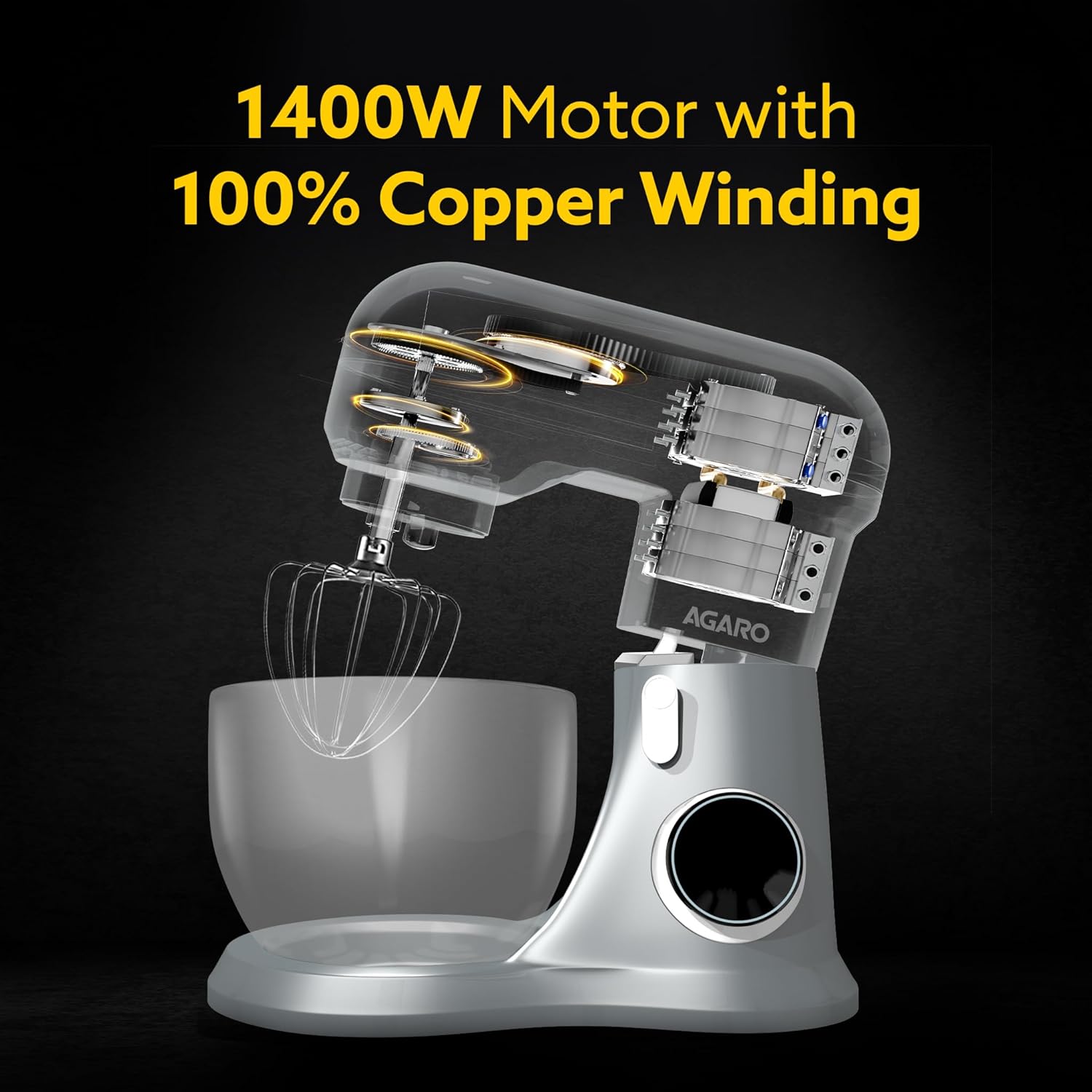 The 1400W stand mixer with a 100% copper motor and a 5.5L stainless steel bowl offers smooth doughing, beating, and whisking, giving you more than enough space for all your cooking needs.