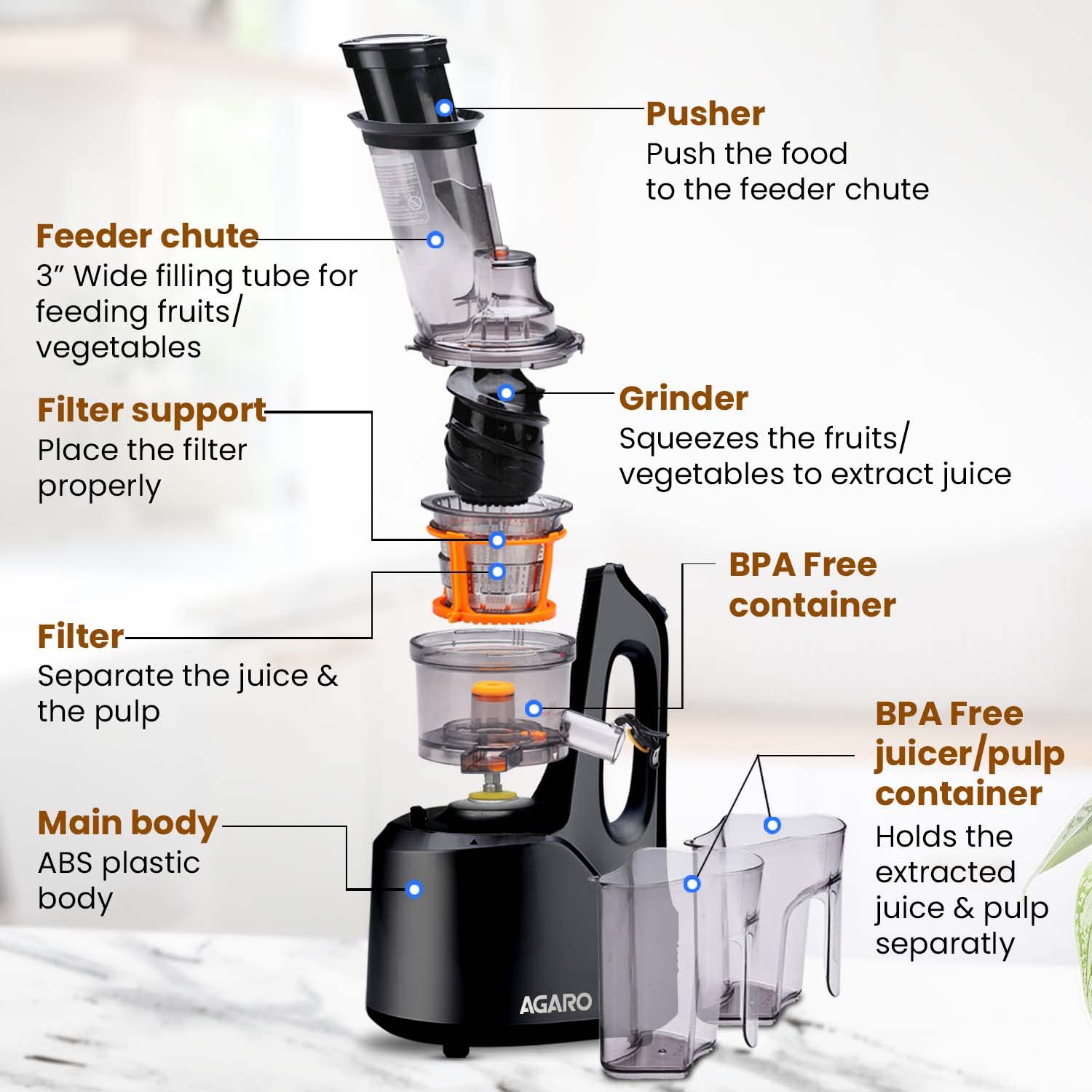 • Cold press technology for maximum juice extraction and nutrients retention.