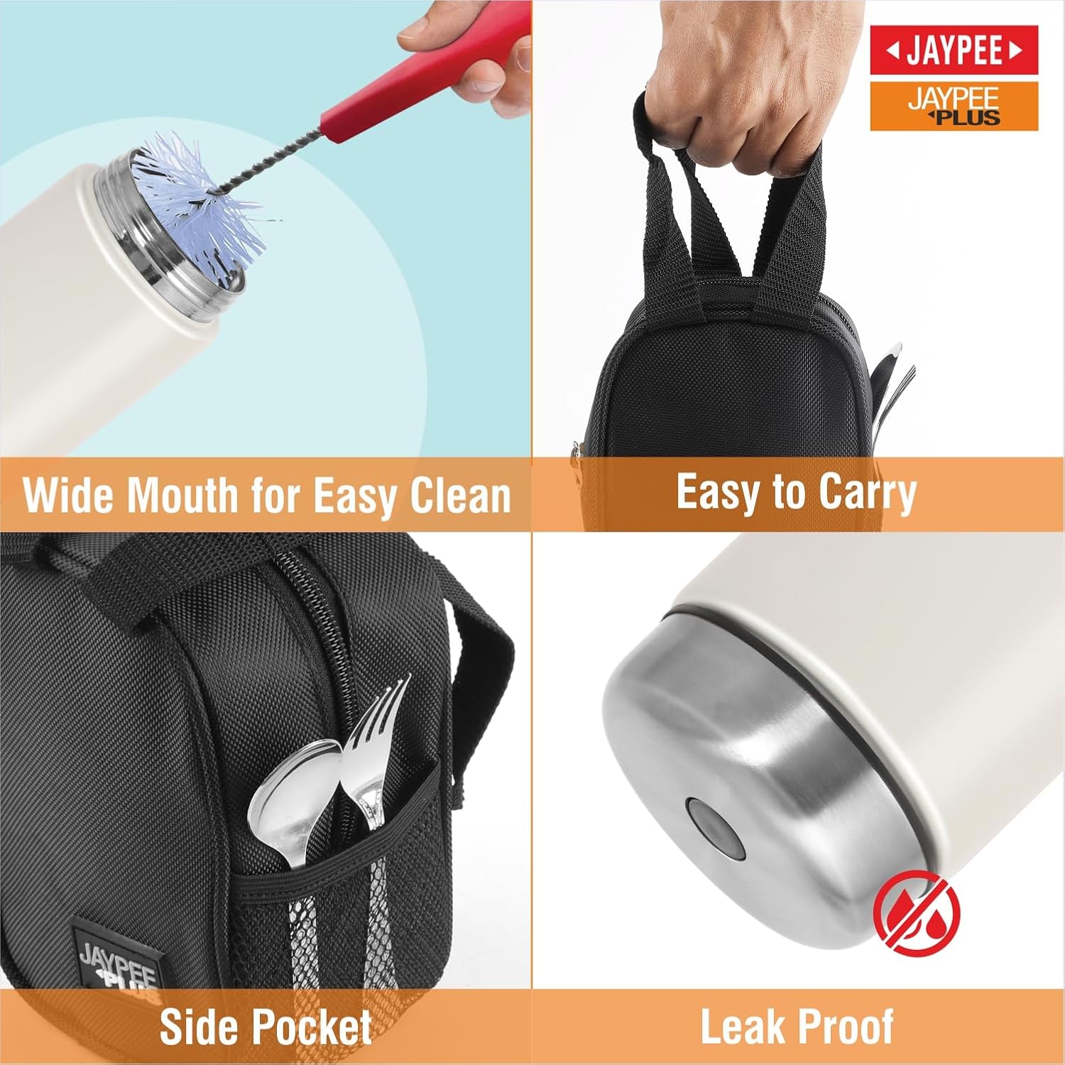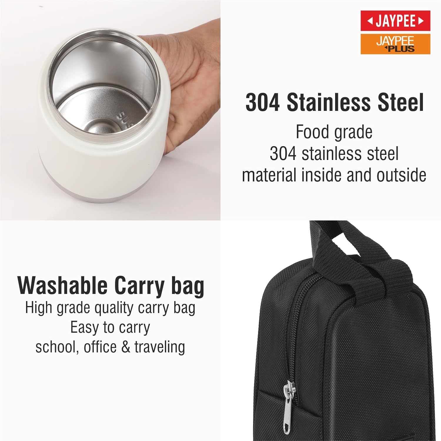 • Jaypee food jar for hot meal comes with a high-grade quality carry bag, featuring a side pocket utensil pocket for convenient storage of spoon and fork. Perfect for office , School , Gym & Picnics meals.