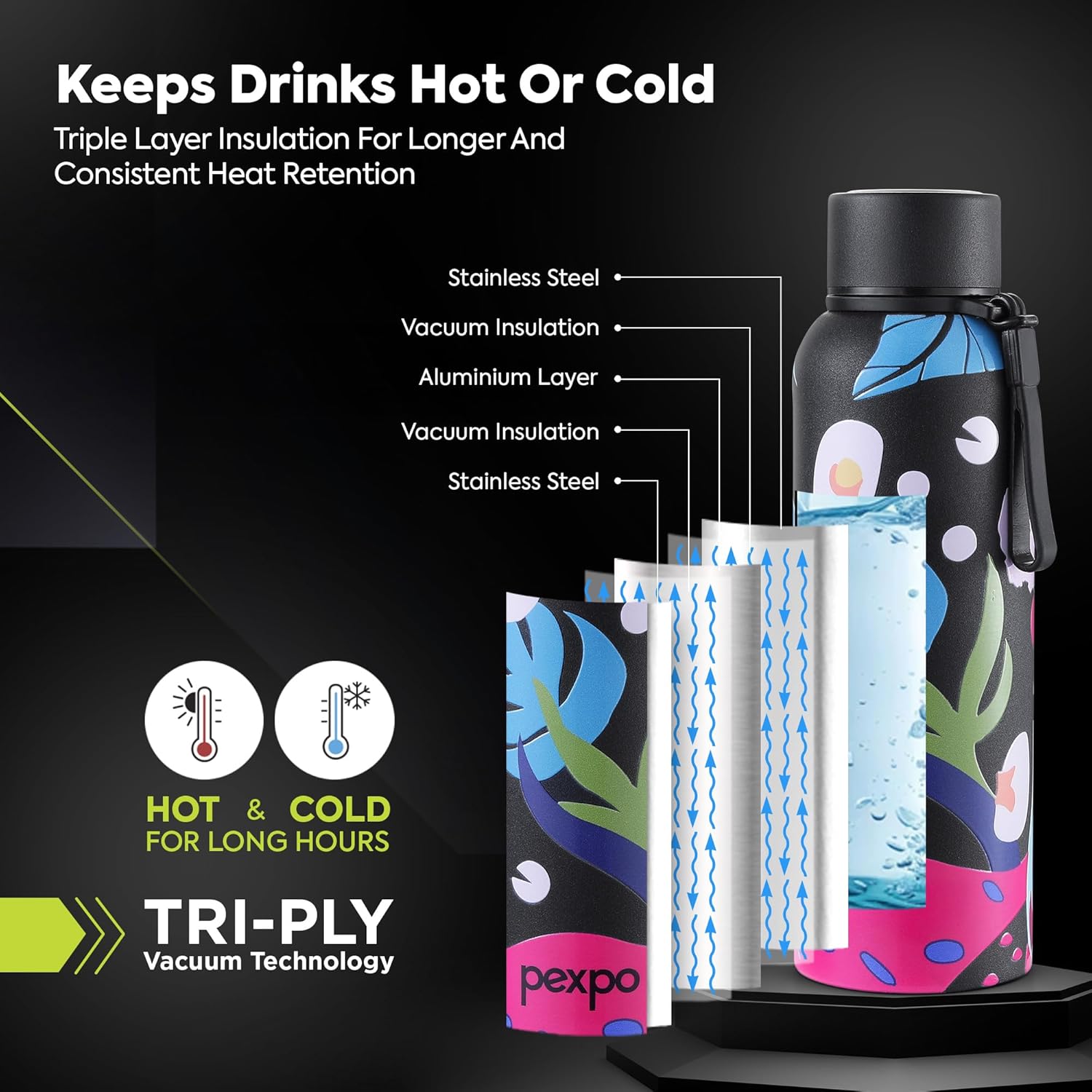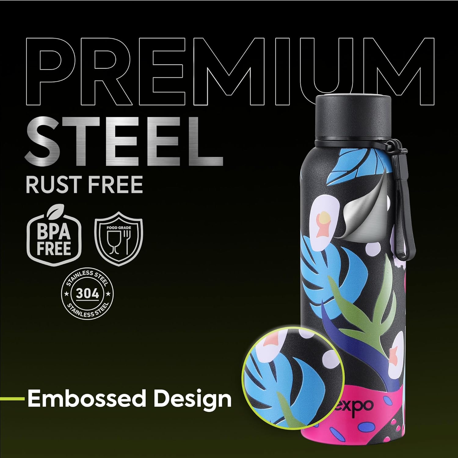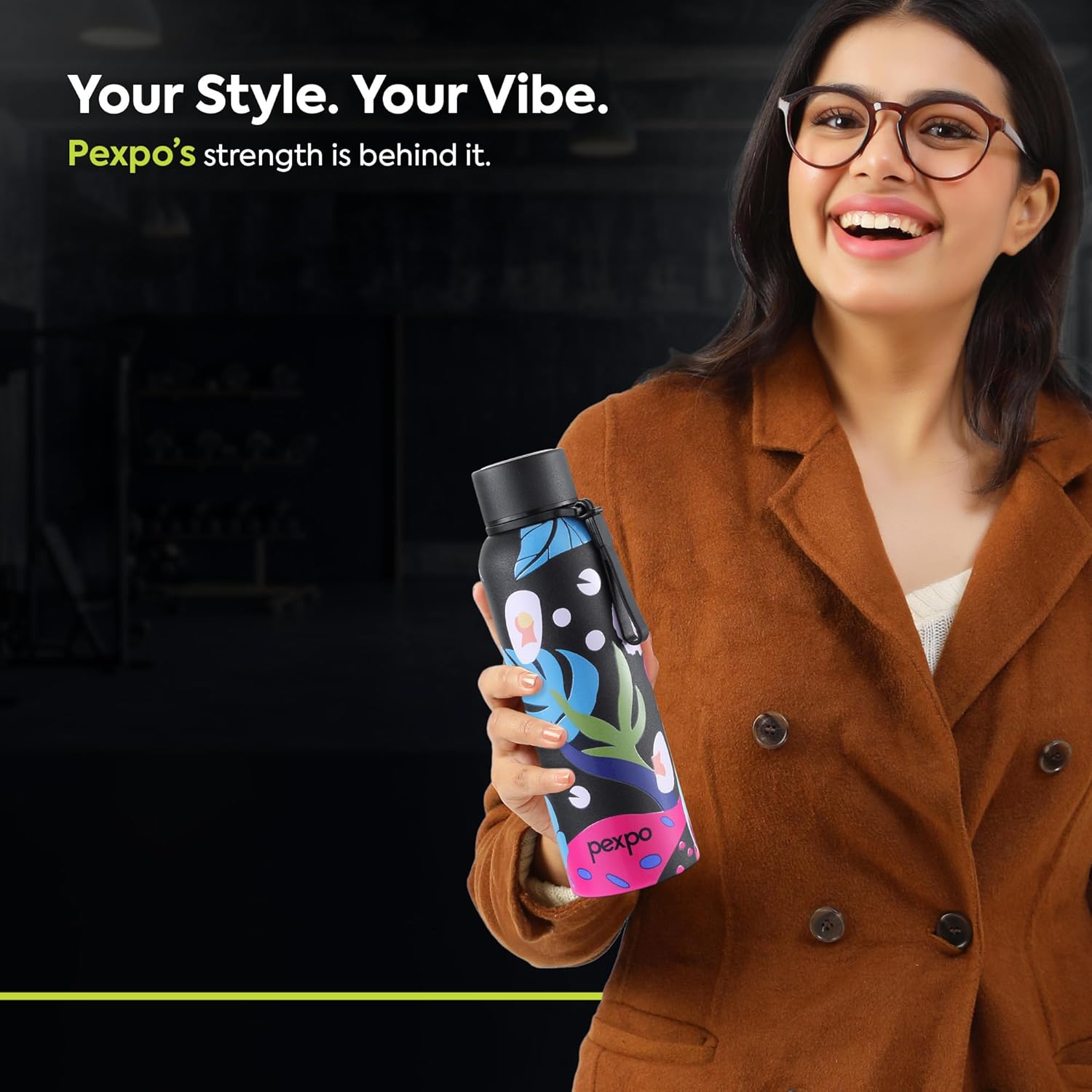 Pexpo Bravo Stainless Steel Water Bottle | 700 ml | Black Leaf-Printed | Hot & Cold |