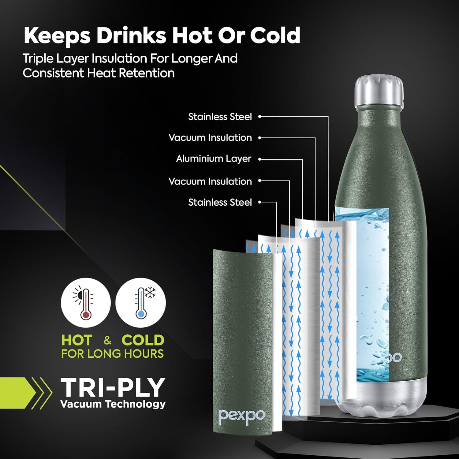 The Pexpo Tri-Ply Vacuum Flask 1750 ml is an ISI-certified, BPA-free hydration companion crafted from premium 304 stainless steel with advanced Tri-Ply Vacuum Technology for superior temperature retention, featuring a durable, easy-to-clean design that is portable, eco-friendly, and ideal for home, gym, travel, and outdoor use.