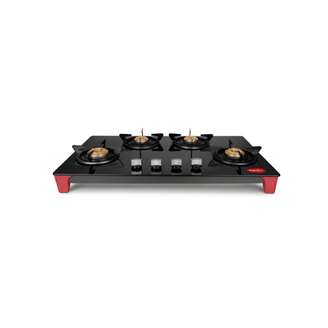 • Gas stove type: Manual; Burner material: Brass; Size of the burner: 1 Big, 1 Jumbo, 2 Small; Material of the body: -; Material of the top: Toughened Glass; Colour: Black
