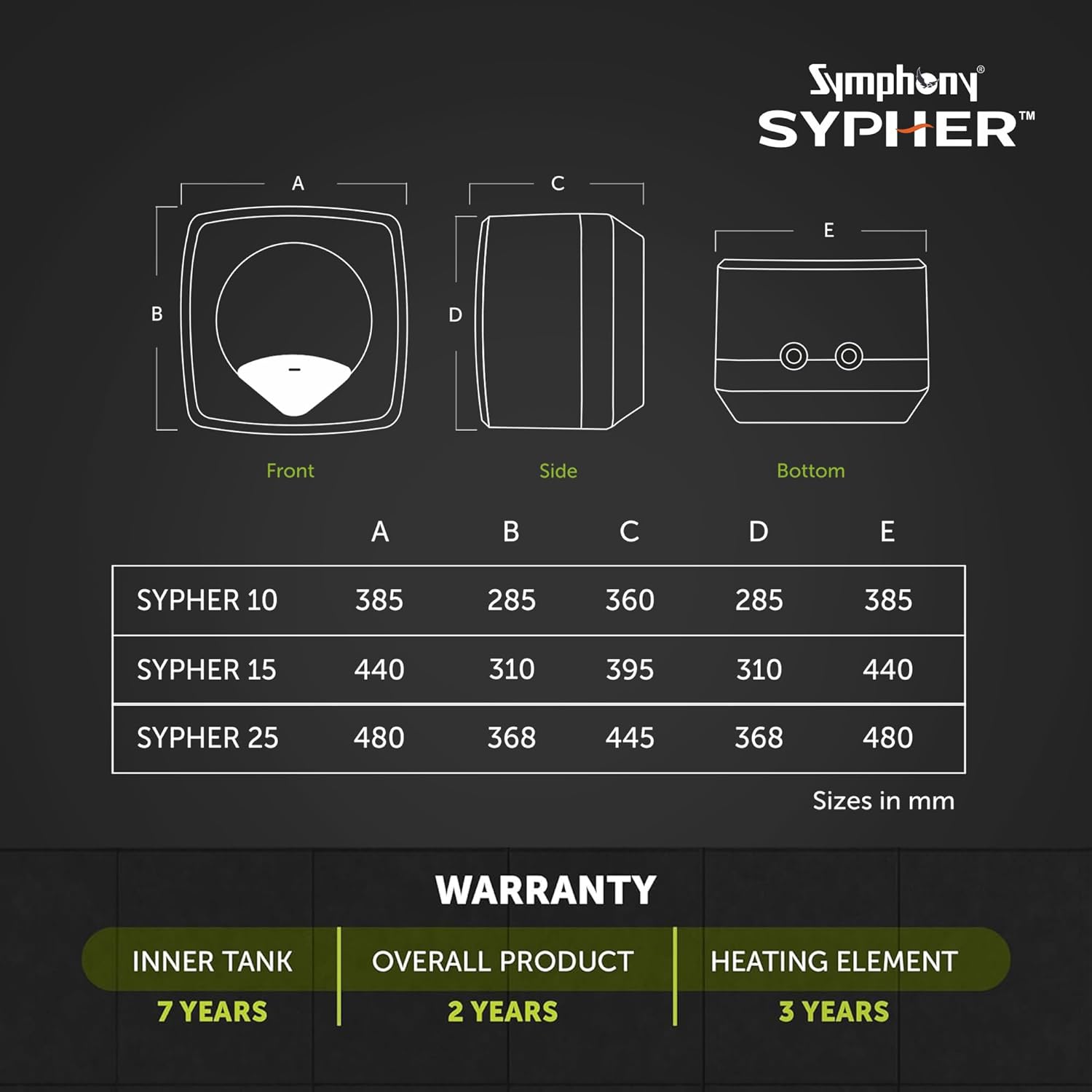 - RELIABLE WARRANTY SUPPORT: Comes with a 7-Year Inner tank warranty, 3-Year Heating Element and 2-Year product warranty, backed by Symphony’s trusted service network across India.
